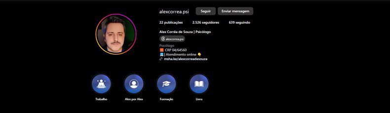 O Psicólogo Alex Corrêa é um excelente profissional, com escuta ativa e fala reflexiva. Sua abordagem é muito clara, humana e efetiva, e isso tem contribuído para o meu autoconhecimento, momentos de reflexividade, entendimento dos meus gatilhos e me auxiliado a ter mais clareza sobre o que sinto, autoestima e segurança. Recomendo a todos!